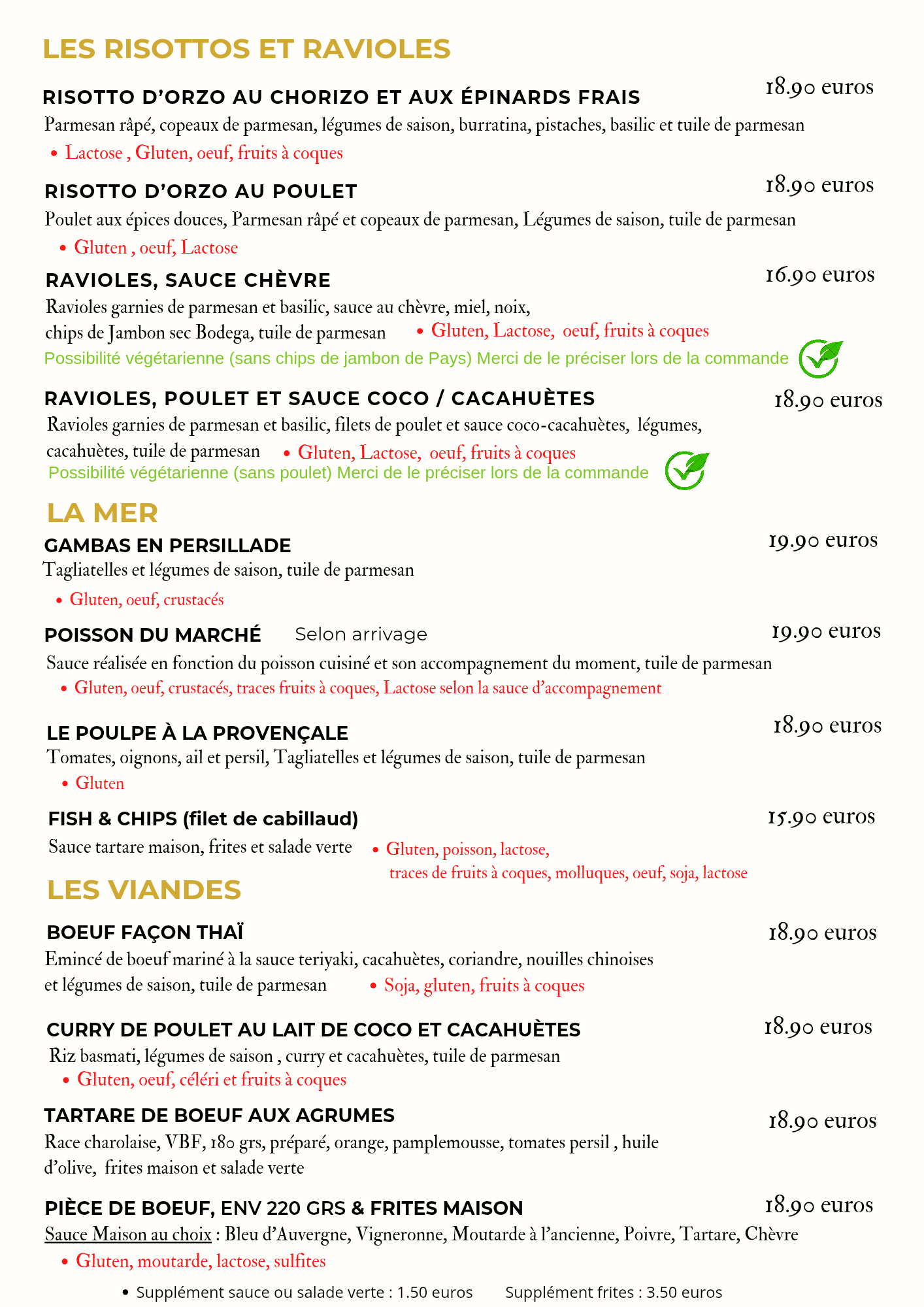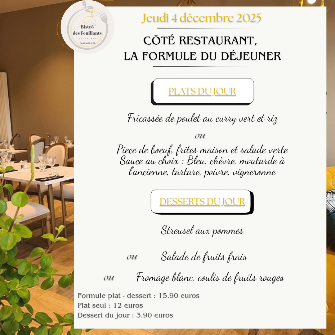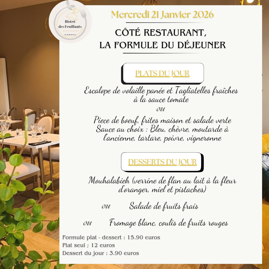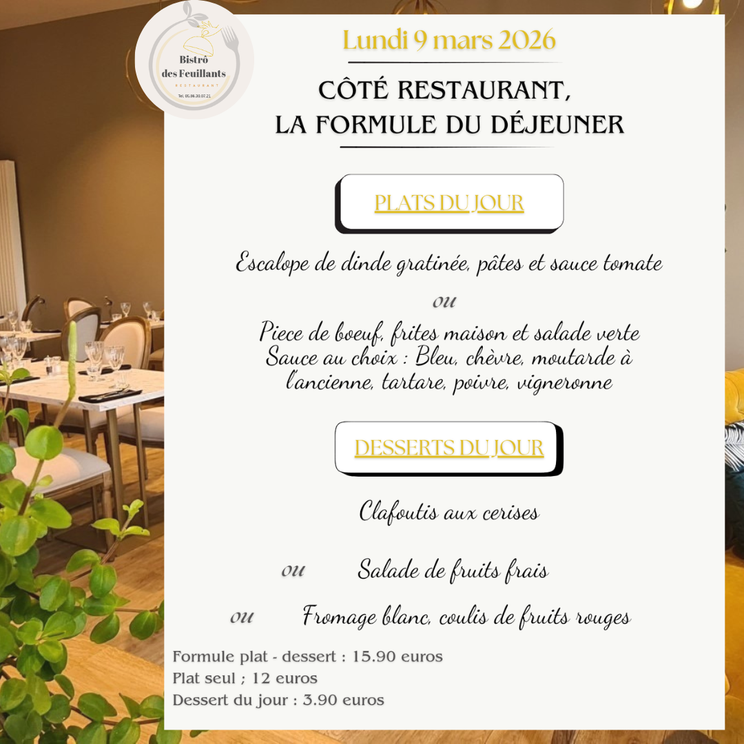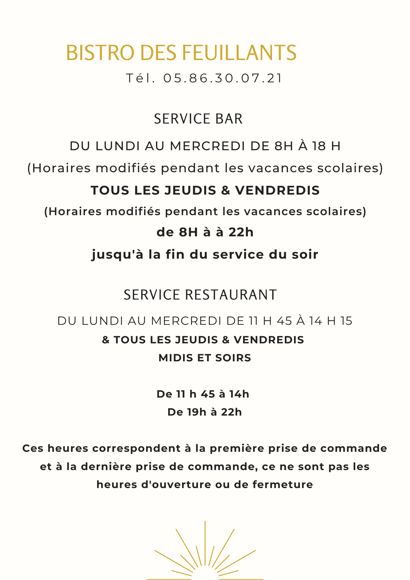 Le service du Restaurant débute à 11 h 45 jusqu'à 14 h 15 du lundi au vendredi et de 18 h 45 à 22h (dernière heure de prise de commande) les Jeudis et Vendredis soirs,
